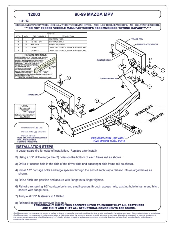Rated to 3,500 lbs. gross trailer weight and 350 lbs. tongue weight; Engineered with a vehicle-specific design for a custom fit; Tested for safety in accordance with SAE J684; Precisely welded for superior strength and fit; Protected by a durable high-gloss black powder coat finish; Co-cured in a rust-resistant liquid A-coat, inside and out; Equipped with an open-back receiver for easy cleaning; Limited lifetime warranty (one-year finish, one-year parts); Made in USA (may include imported hardware); Class 2 Trailer Hitch, 1-1/4 Receiver, Select Mazda MPV