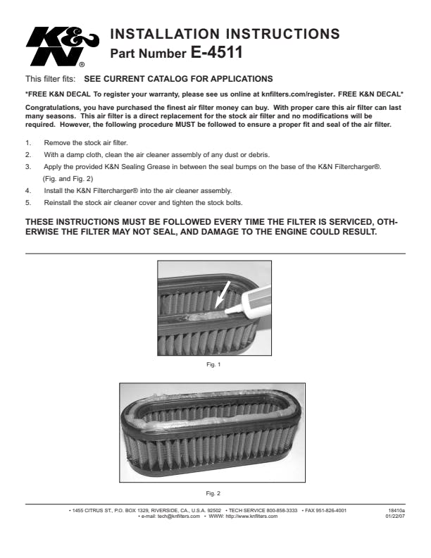 | Package Contents | 1 Air Filter, 1 K&N 1oz Sealing Grease |