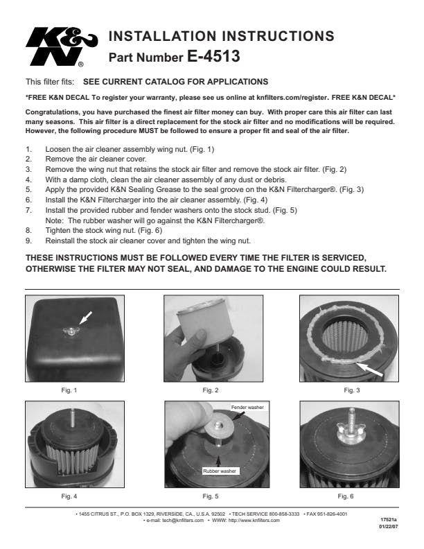 | Package Contents | 1 Air Filter, 1 K&N 1oz Sealing Grease |