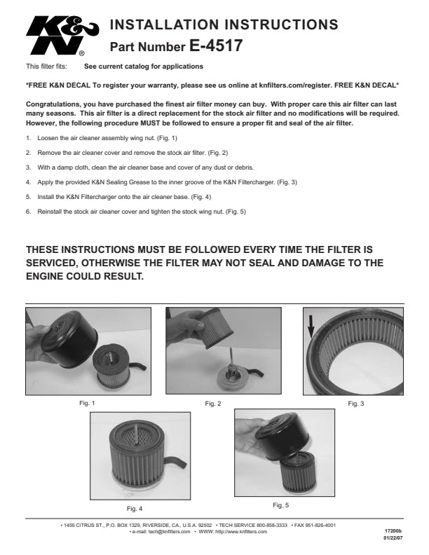 The E-4517 provides superior filtration protecting your equipment's engine. This K&N air filter can be cleaned and it comes with a lifetime limited warranty
