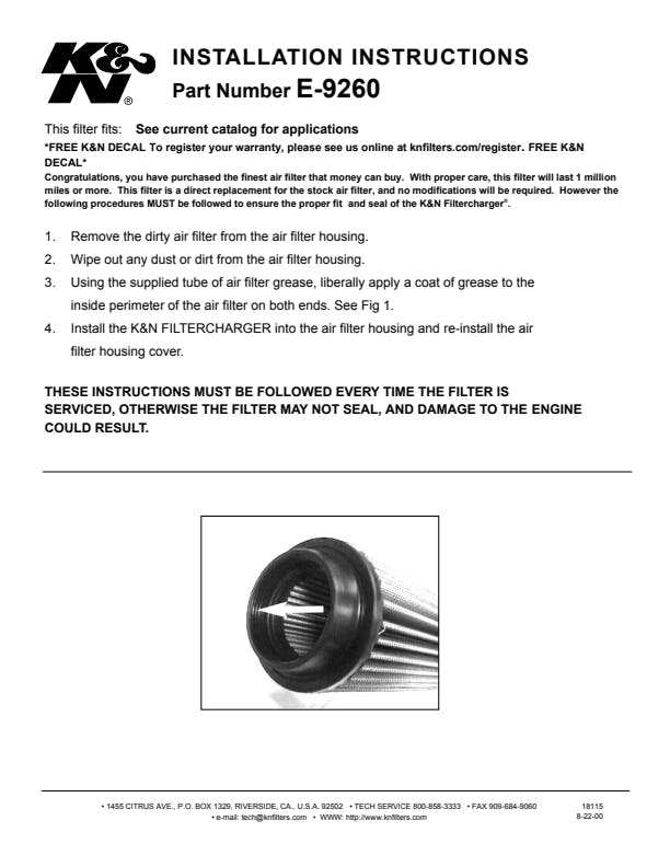| Package Contents | 1 Air Filter, 1 K&N 1oz Sealing Grease |
