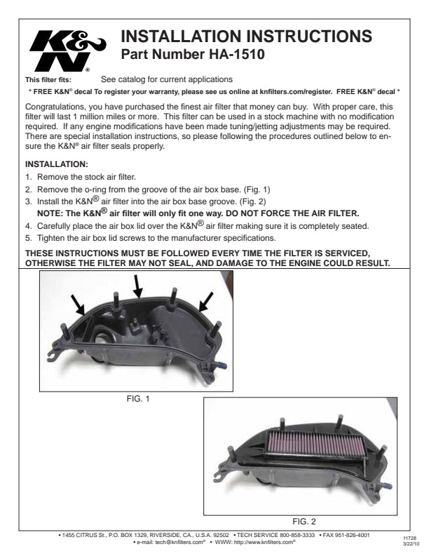 K&N's high-flow air filters are available as a replacement for your stock motorcycle air filter element. They are custom engineered to fit your specific application and are designed to provide low restriction and increased performance, while providing excellent engine protection for your motorcycle.