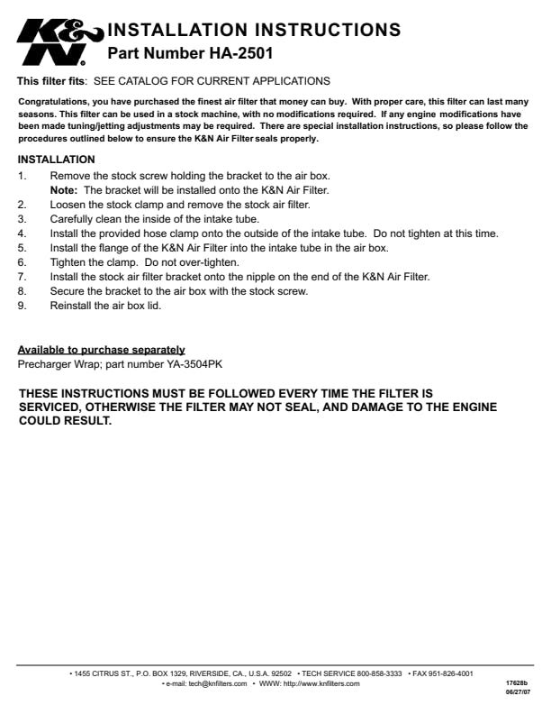 K&N Replacement Air Filters are ideal for extended use in dirty and dusty off-road riding and provide clean carburetion even at high altitude. K&N air filters are washable and reusable and provide high air-flow with excellent filtration.