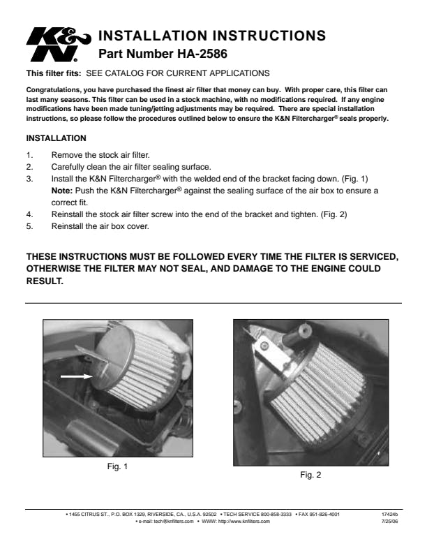 K&N's high-flow air filters are available as a replacement for your stock motorcycle air filter element. They are custom engineered to fit your specific application and are designed to provide low restriction and increased performance, while providing excellent engine protection for your motorcycle.