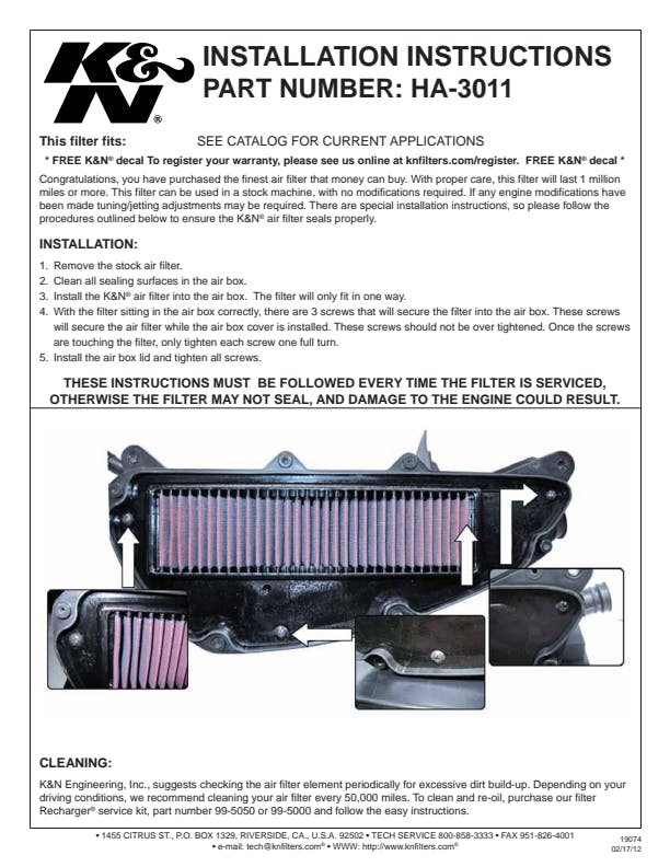K&N's high-flow air filters are available as a replacement for your stock motorcycle air filter element. They are custom engineered to fit your specific application and are designed to provide low restriction and increased performance, while providing excellent engine protection for your motorcycle.