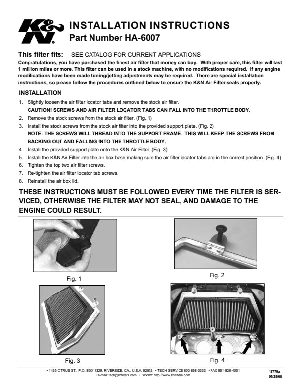 K&N's high-flow air filters are available as a replacement for your stock motorcycle air filter element. They are custom engineered to fit your specific application and are designed to provide low restriction and increased performance, while providing excellent engine protection for your motorcycle.