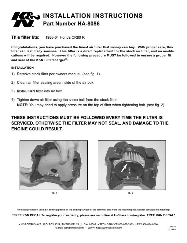 K&N Replacement Air Filters are ideal for extended use in dirty and dusty off-road riding and provide clean carburetion even at high altitude. K&N air filters are washable and reusable and provide high air-flow with excellent filtration.