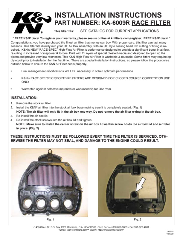 This K&N racing air filter has just two layers of cotton to provide even lower air restriction than our replacement air filter for street vehicles. Unlike K&N replacement air filters, fuel management modifications will be necessary with this racing filter. K&N racing air filters are washable and reusable and come with a one year limited warranty. This product is for closed course competition use only.