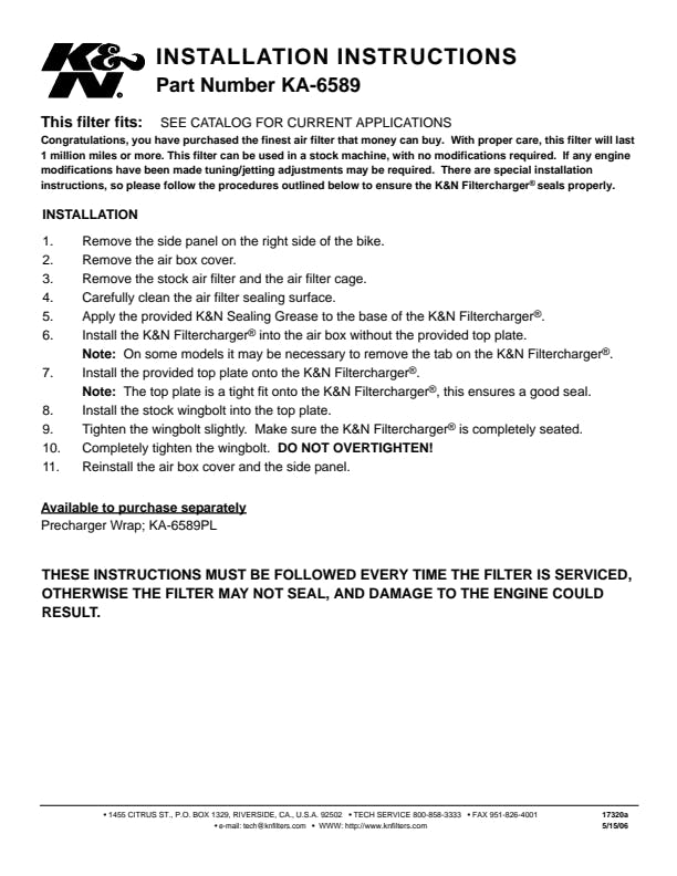 1 Air Filter, 1 K&N 1oz Sealing Grease, 1 Filter Plate |