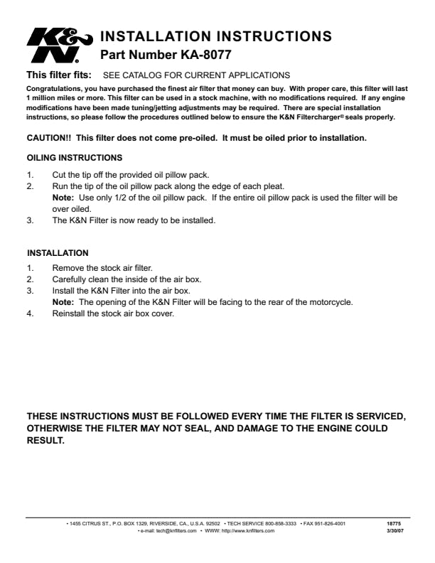 1 Air Filter, 1 K&N 1/2oz Filter Oil |