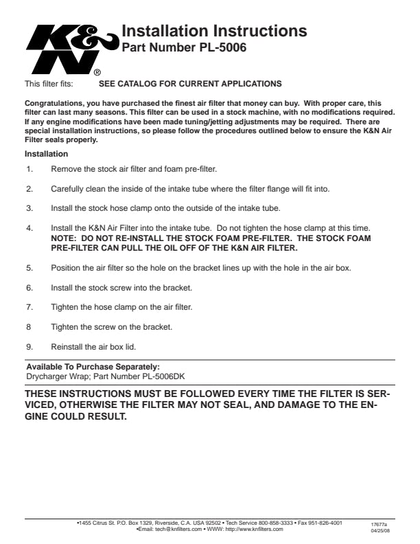 K&N off-road replacement air filters are ideal for extended use in dirty and dusty off-road riding and provide clean carburetion even at high altitude. Generally, no jet changes are required with just a K&N filter element. K&N replacement air filters are washable and reusable and provide high air-flow with excellent filtration.
