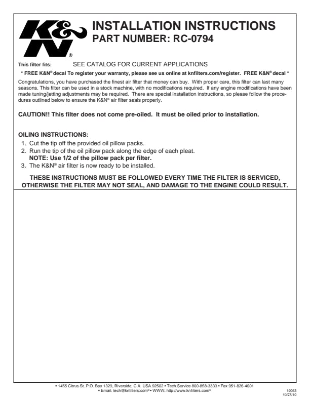 K&N's Universal Air Filters are designed and manufactured for a wide variety of applications including racing vehicles, radio-controlled cars, generators, snowmobiles, tractors, and other applications. Regardless of the angle or offset diameter of the air intake, there is probably a K&N Universal air filter for your equipment. All filters are constructed with ultra-strong molded pliable rubber flanges which absorb vibration and allow for secure attachment and can also be stretched for up to 1/16 of an inch (1.5mm) to fit in-between sizes. K&N universal air filters are washable and reusable.