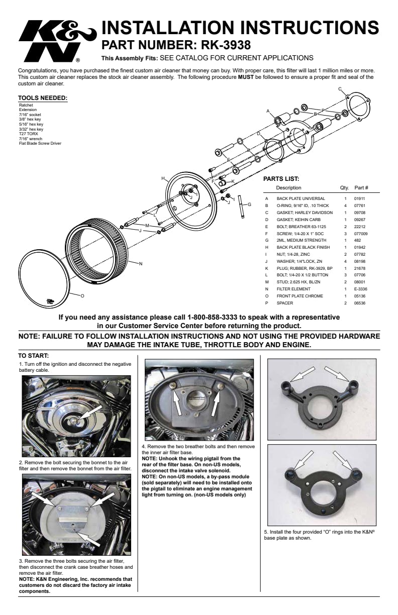 K&N's Street Metal Series High-Flow Air Intake Systems provide a good looking appearance, offer increased airflow and deliver more horsepower & torque to your Harley-Davidson motorcycle. These intake systems increase power by eliminating the stock OE air cleaner and replacing it with a complete high-flow air intake system. The sturdy, custom aluminum backing plate mounts directly to the throttle body via an aluminum integrated, internal-run breather system. The intake system comes with a K&N Air Filter for high air flow and long service intervals. A durable mounting gasket is also included to help absorb vibration. The K&N high-flow air filter is washable, reusable, pre-oiled and ready for installation. Simple designed custom covers give this air intake good looks while powering down the highway or at your local show.